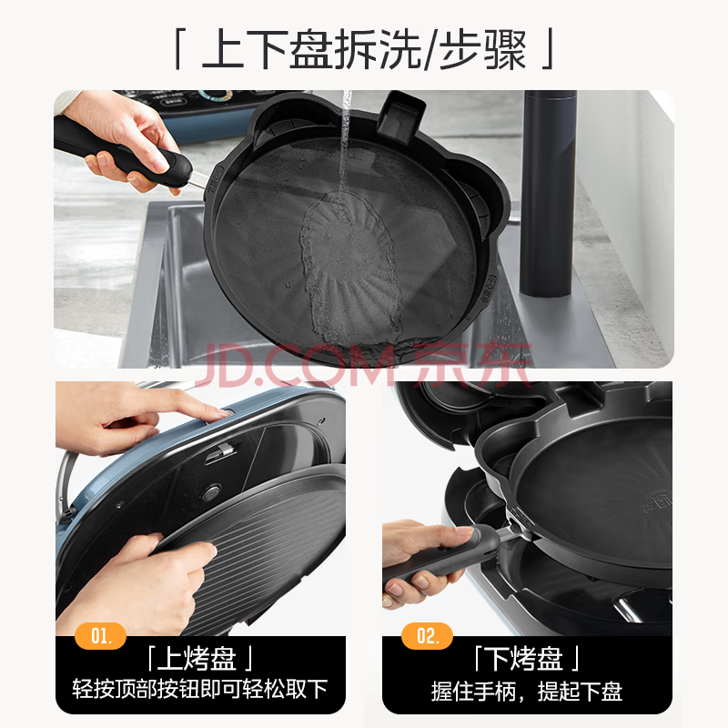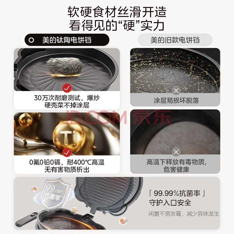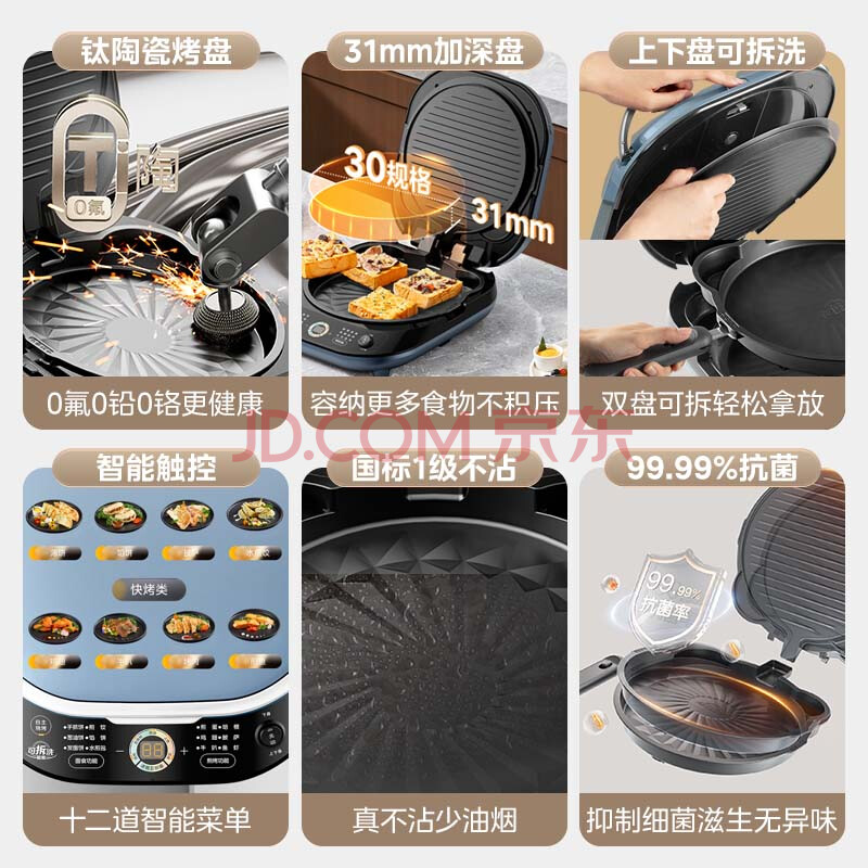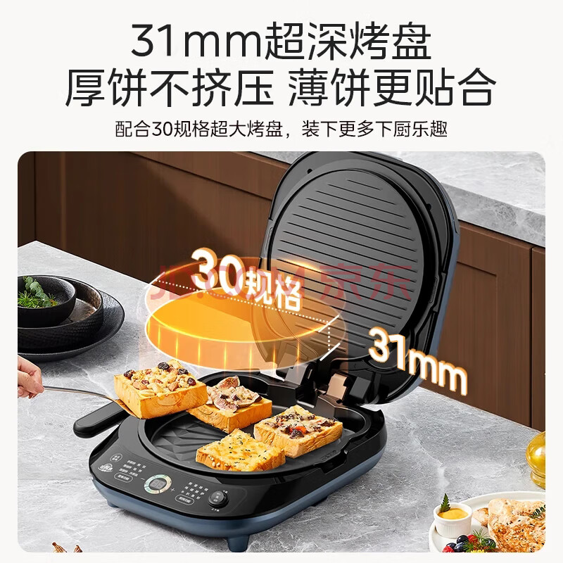 商品相册:美的(Midea)电饼铛 电饼档上下盘可拆洗家用智能0氟钛陶瓷双面加热三明治早餐机煎烤机煎饼锅烙饼锅 JKC3077Ti第