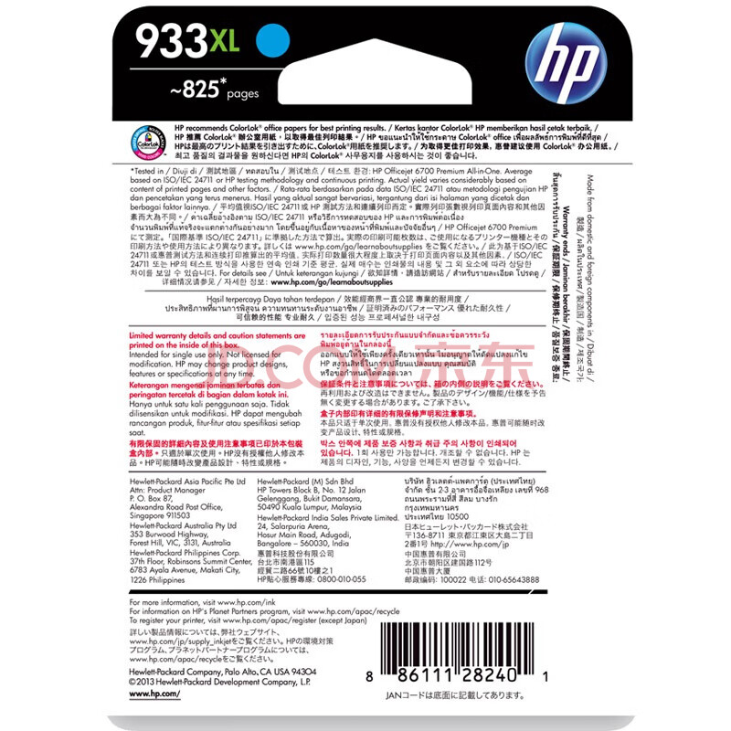 商品相册:惠普(HP)原装墨盒 CN054AA 933XL 青色墨盒 适用于HP Officejet 7110/7610/7612/7510设备第