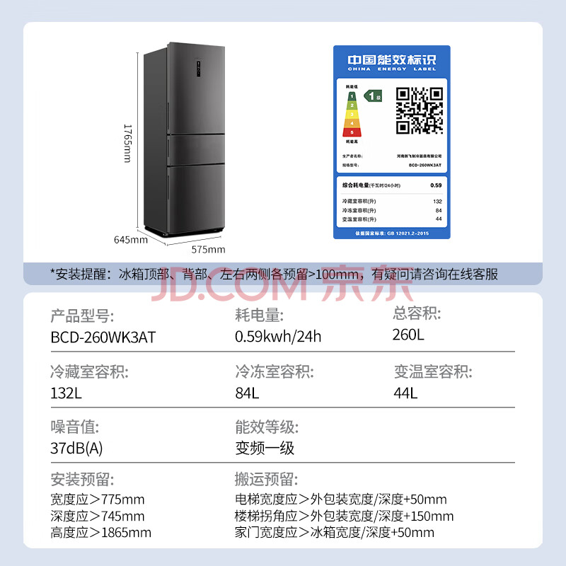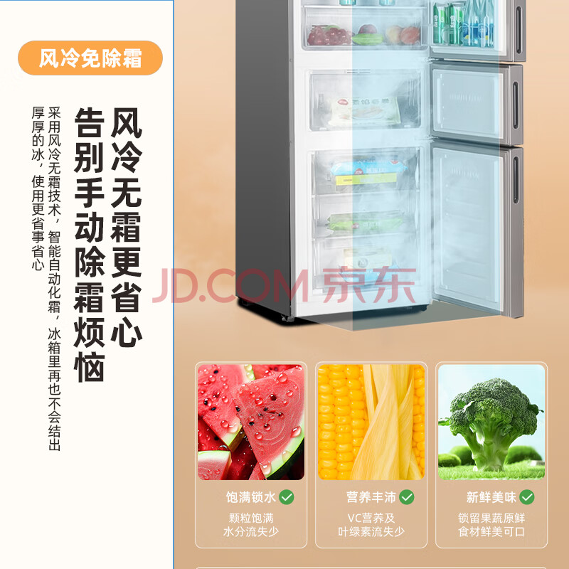 商品相册:新飞260L三门变频一级能效 风冷无霜宽幅智能变温节能冰箱 BCD-260WK3AT 第
