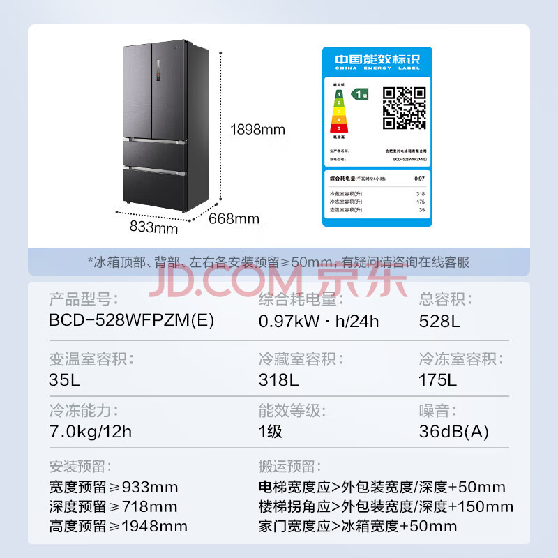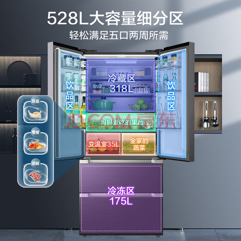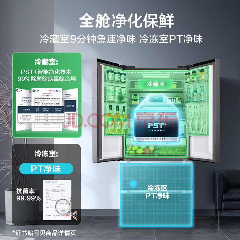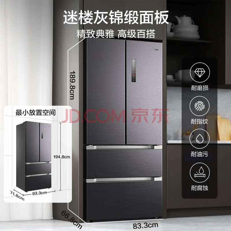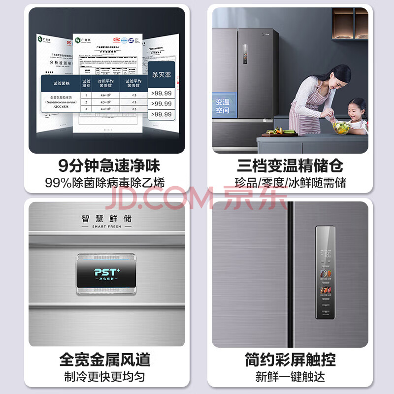 商品相册:美的(Midea)9分钟急速净味528升一级能效变频法式四门大容量无霜家用冰箱BCD-528WFPZM(E) 第