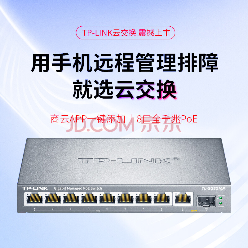 商品相册:TP-LINK 云交换TL-SG2210P 全千兆10口Web网管 云管理PoE交换机 (8PoE口+1千兆口+1千兆SFP) 企业级分流器第