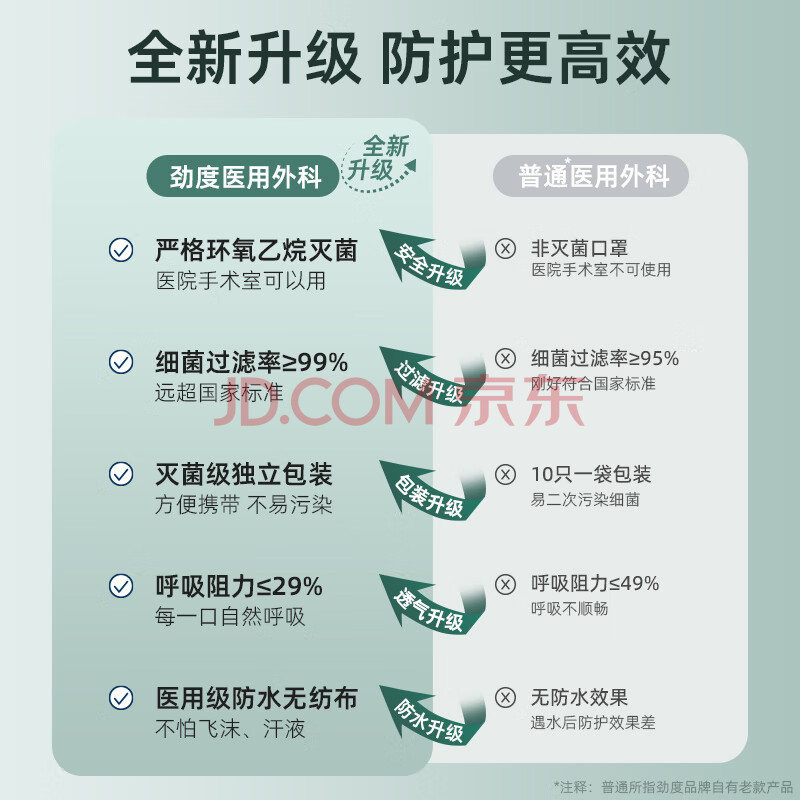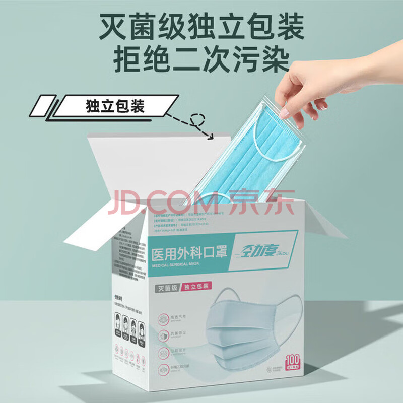 商品相册:劲度(JINDU)一次性医用外科口罩100只独立装无菌三层防护成人口罩医用灭菌级第