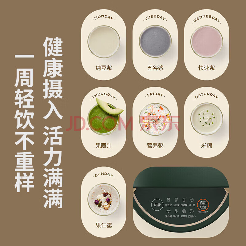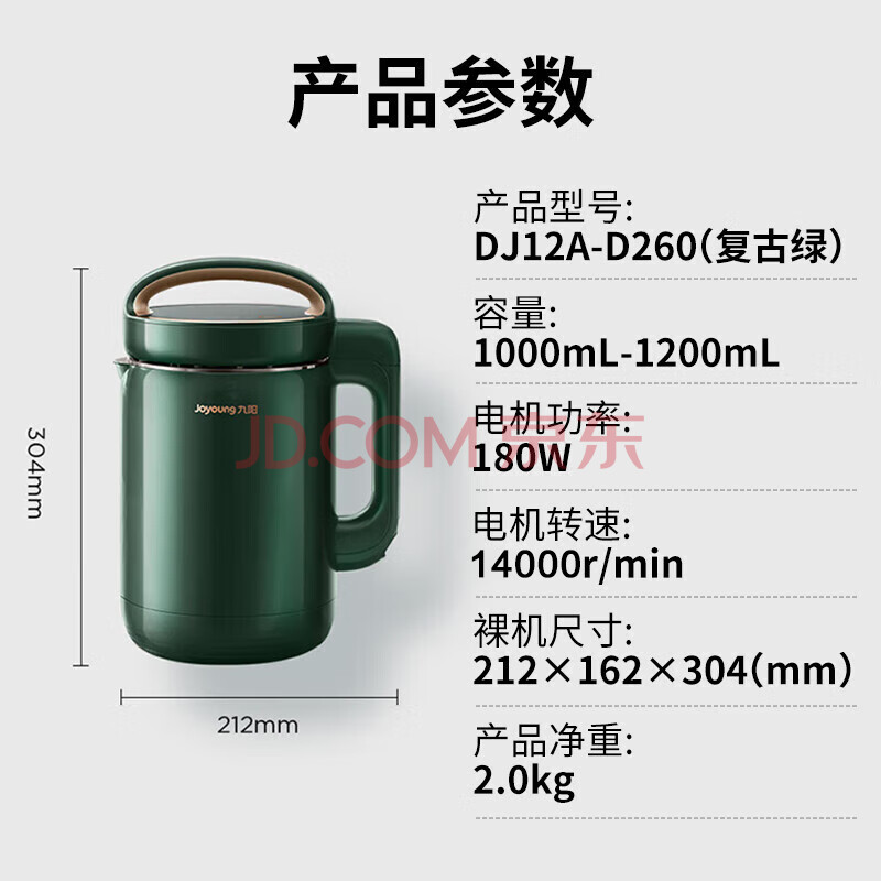 商品相册:九阳(Joyoung)豆浆机 1.2L破壁免滤双层杯体304级不锈钢家用多功能榨汁机料理机 DJ12A-D260(复古绿)第