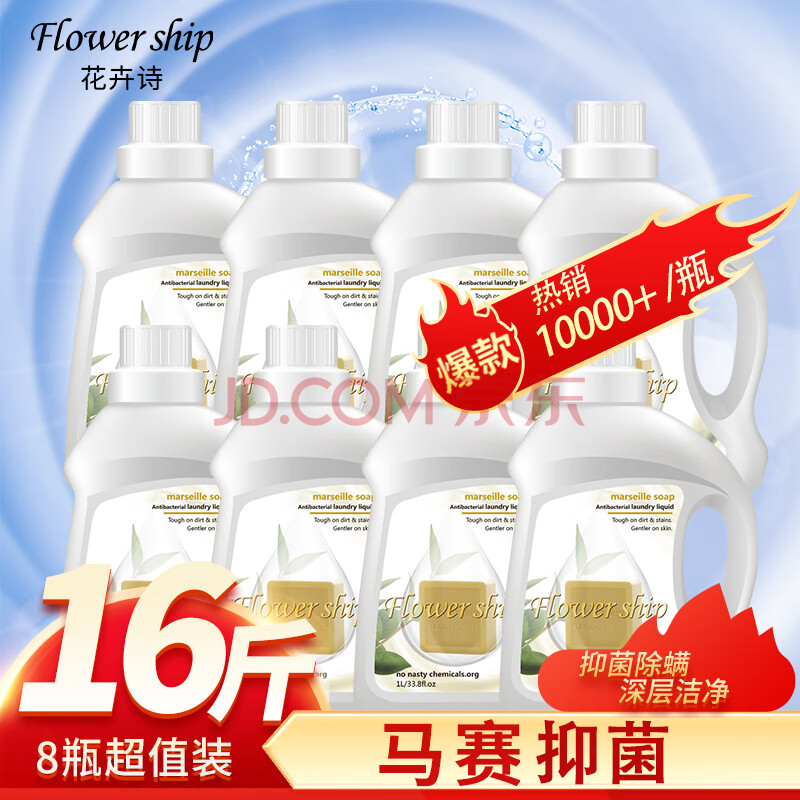 商品相册:花卉诗(Flower ship)抑菌防螨洗衣液超值家庭装16斤(1kg*8瓶)深层洁净祛味无残留第