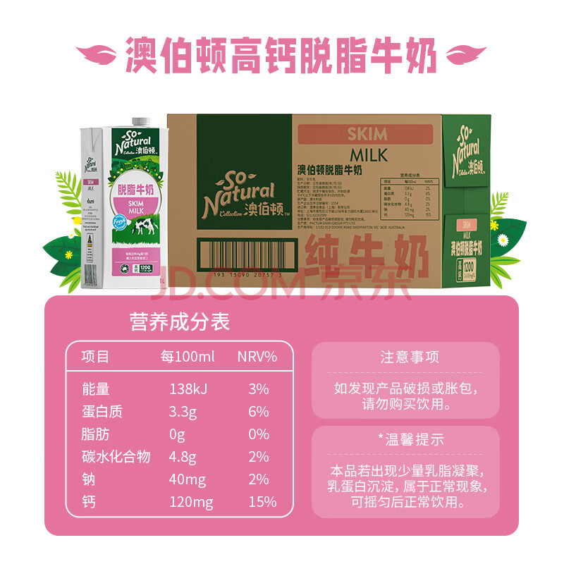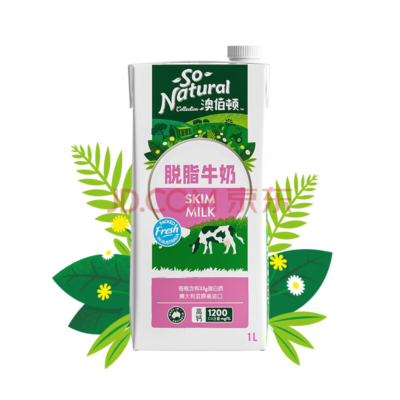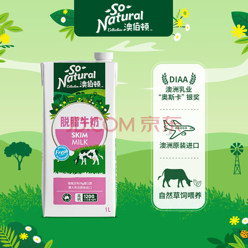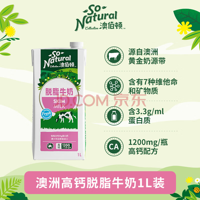 商品相册:澳伯顿So Natural 脱脂纯牛奶1L*12盒整箱 澳大利亚原装进口 第1张/共7