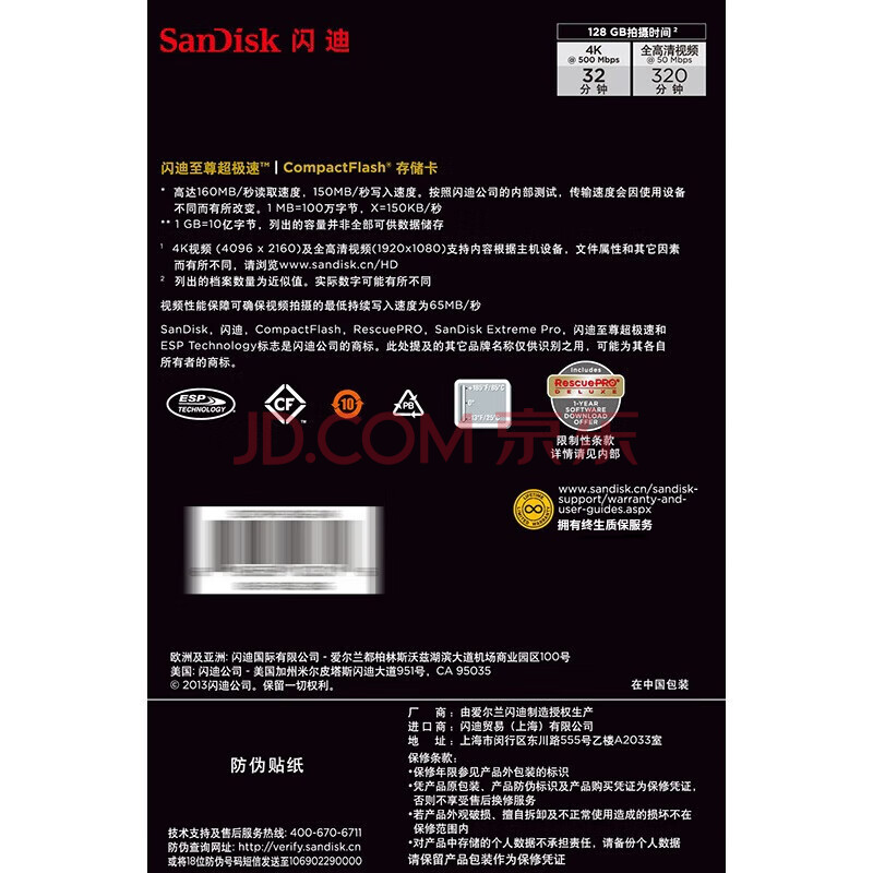 商品相册:闪迪(SanDisk)128GB CF(CompactFlash) 内存卡 4K 3D UDMA-7 至尊超极速相机存储卡 读速160MB/s 写速150MB/s第