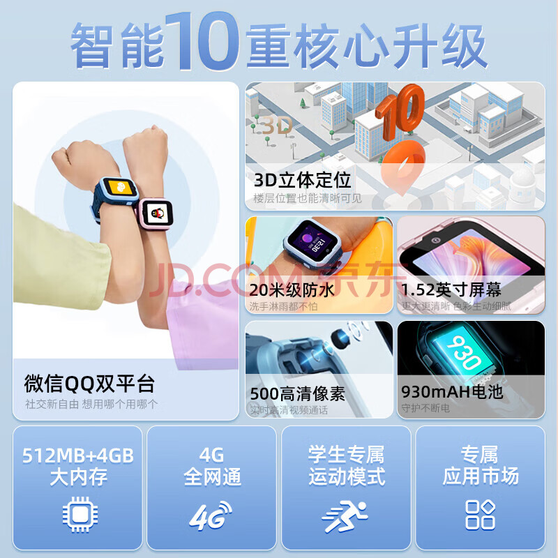 商品相册:360儿童电话手表10X长续航GPS定位4G全网通20米防水微信QQ可插卡初中生学生智能手表男女表蓝第