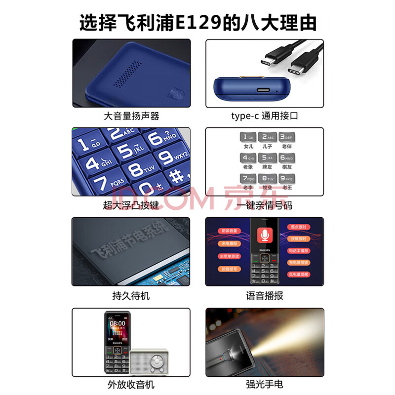 商品相册:飞利浦(PHILIPS)E129 宝石蓝 移动老人手机 大字体大声音老年机 超长待机直板按键2G学生备用功能机第