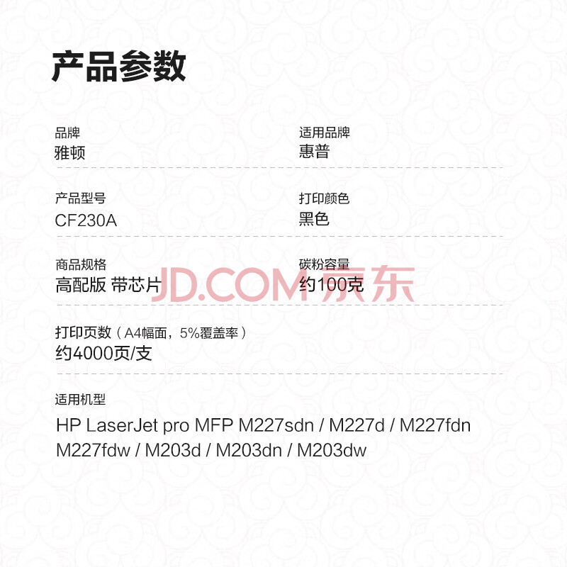 商品相册:雅顿适用惠普m227fdw硒鼓粉盒 惠普hp m227fdn墨盒 m227sdn打印机硒鼓 m203dw m203dn 30a墨盒 cf230a粉盒第