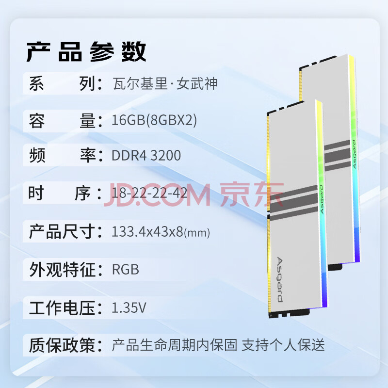 商品相册:阿斯加特16GB(8GBx2) DDR4 3200 台式机内存条 女武神·瓦尔基里 RGB灯条 精选颗粒 CL18 极地白第