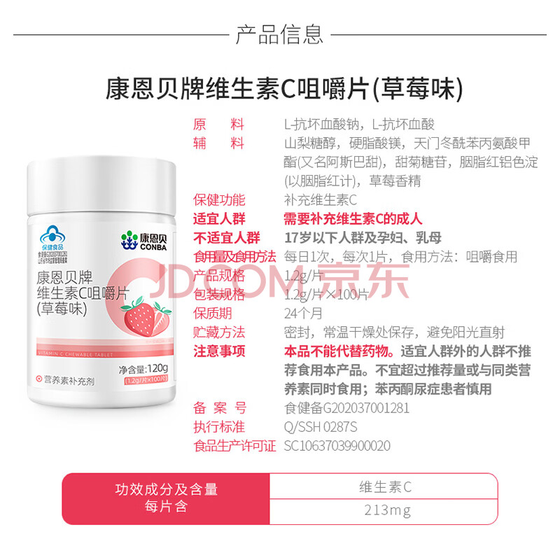 商品相册:康恩贝 维生素C咀嚼片 1.2g*100片 vc 维c 补充VC草莓味第1张/共8