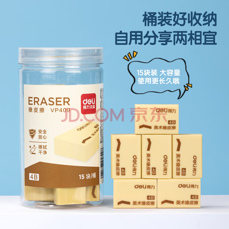 商品相册:得力(deli) 15块装橡皮擦 美术绘图橡皮柔软易擦少屑学生中考高考开学文具 黄色桶装第
