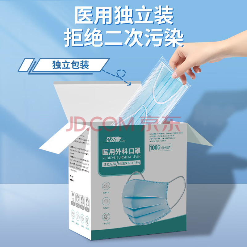 商品相册:劲度(JINDU) 一次性医用外科口罩100只独立装医用防护三层防粉尘飞沫成人口罩第