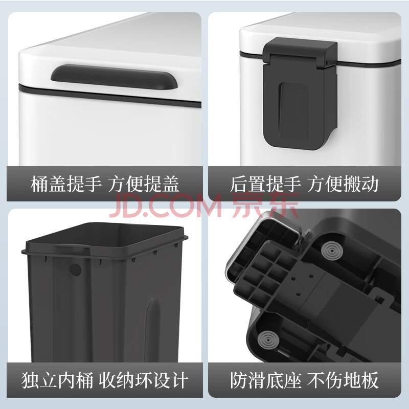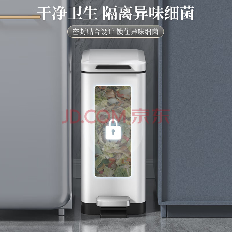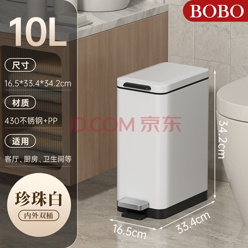 商品相册:BOBO不锈钢垃圾桶10L白色卫生间夹缝脚踏式厕所脚踩带盖客厅8877第