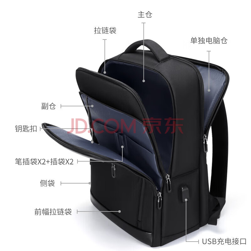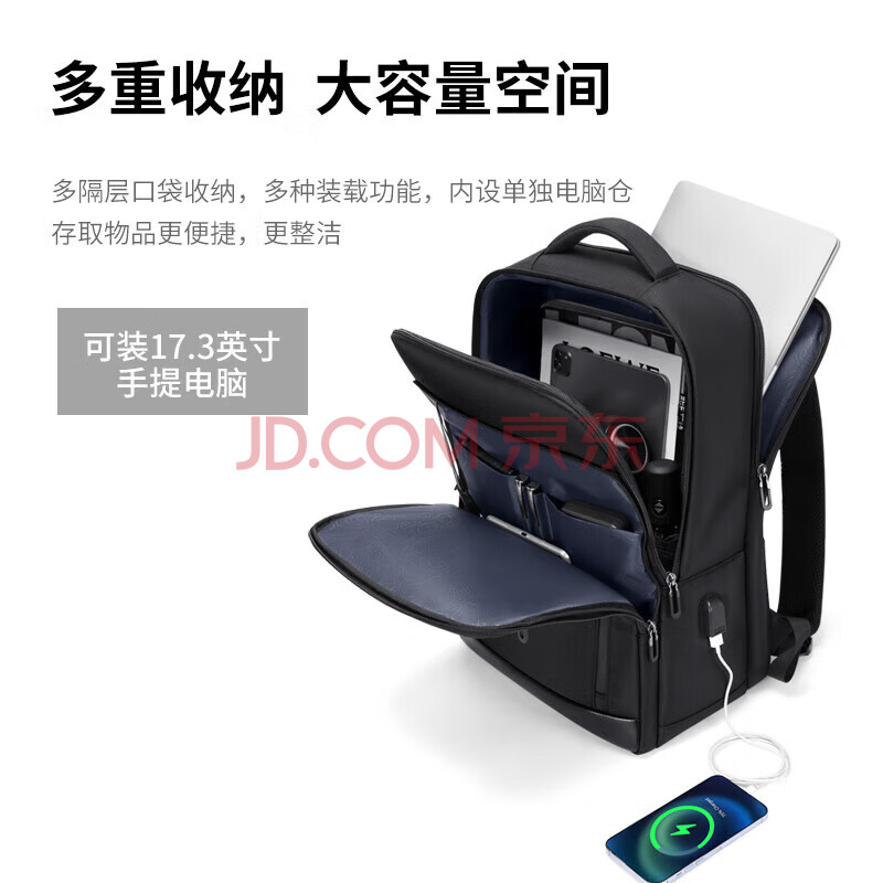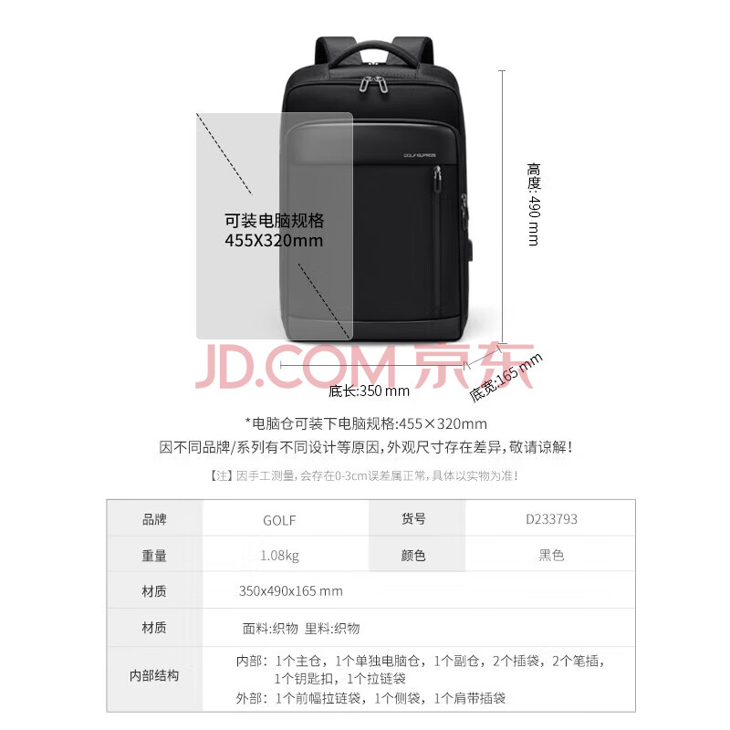 商品相册:高尔夫(GOLF)双肩包男士多隔层背包男17.3英寸电脑学生书包商务旅行背包 黑色第