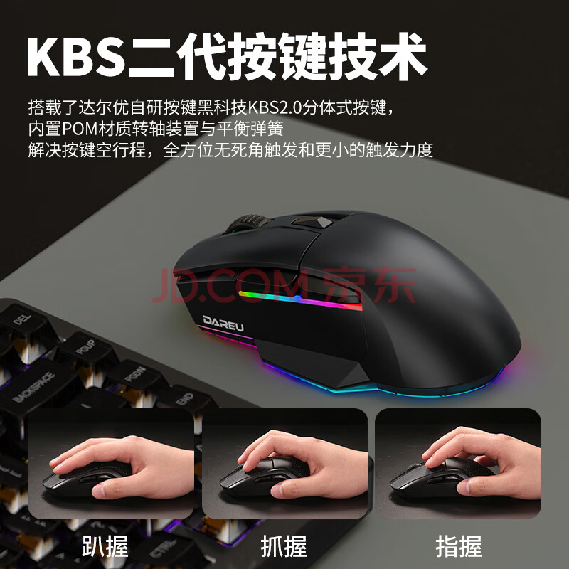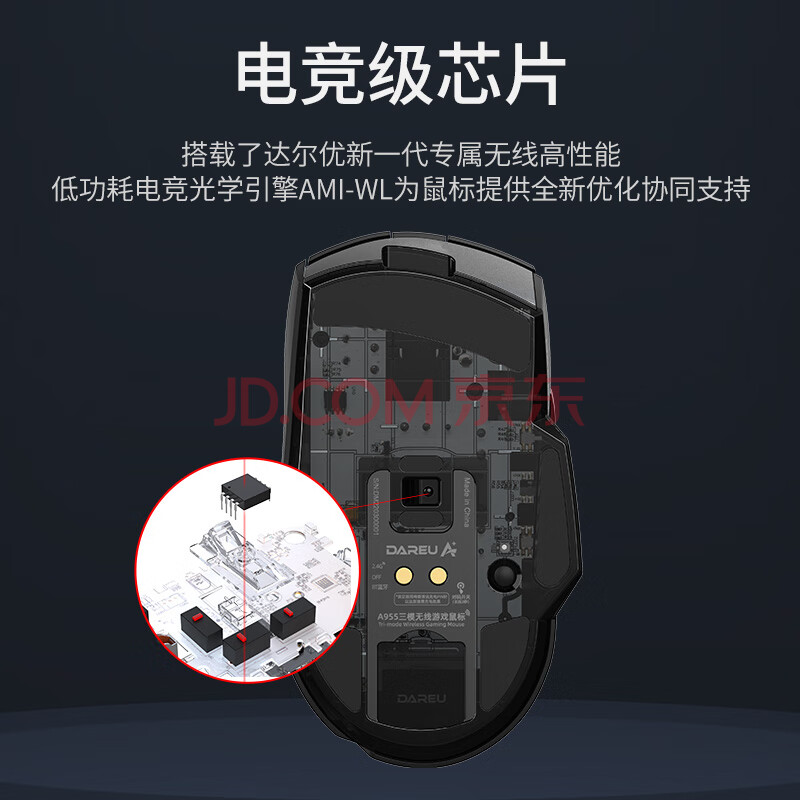 商品相册:达尔优(dareu)A955黑色适合中大手无线蓝牙三模电竞游戏鼠标KBS2.0衡力PBT按键透明底壳第