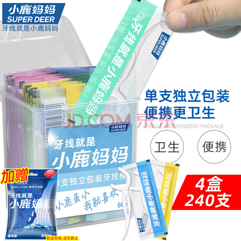 商品相册:小鹿妈妈超细牙线棒单支便携独立装牙签家庭装餐厅牙线棒牙签4盒240第