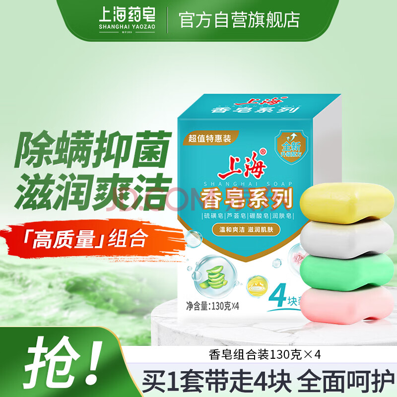 商品相册:上海香皂130g*4块(硫磺+芦荟+硼酸+润肤)抑菌除螨洁净洗澡沐浴皂肥皂第