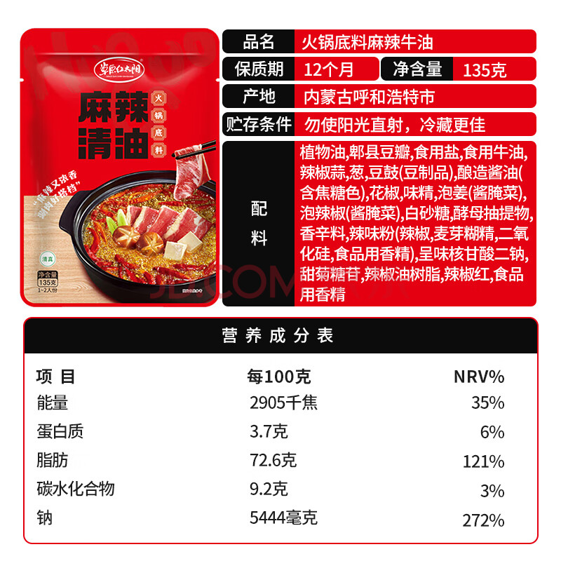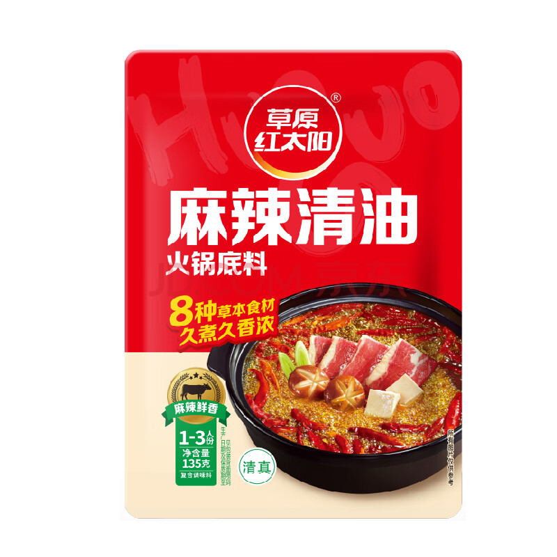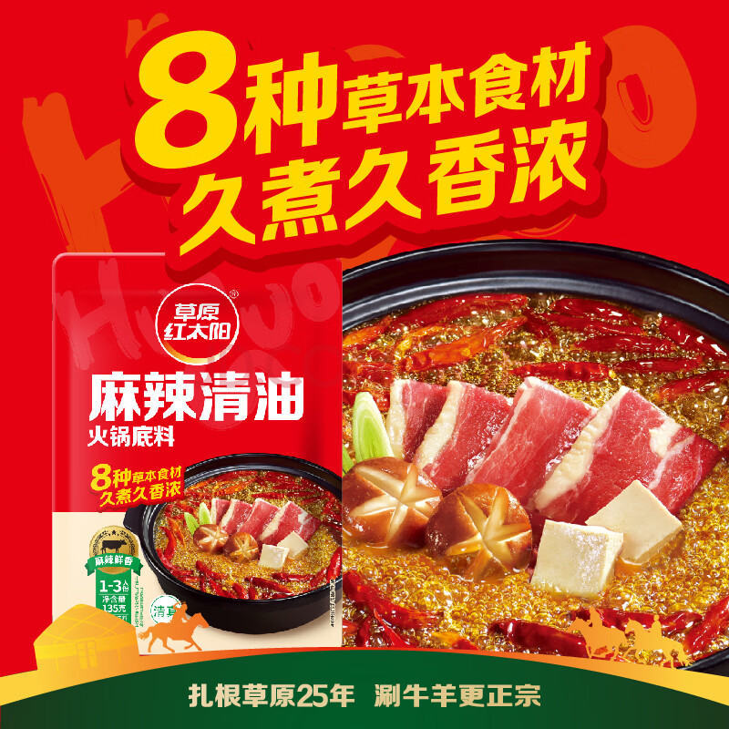 商品相册:草原红太阳火锅底料 麻辣清油火锅底料135g 1~2人份 麻辣烫底料新老包装随机第