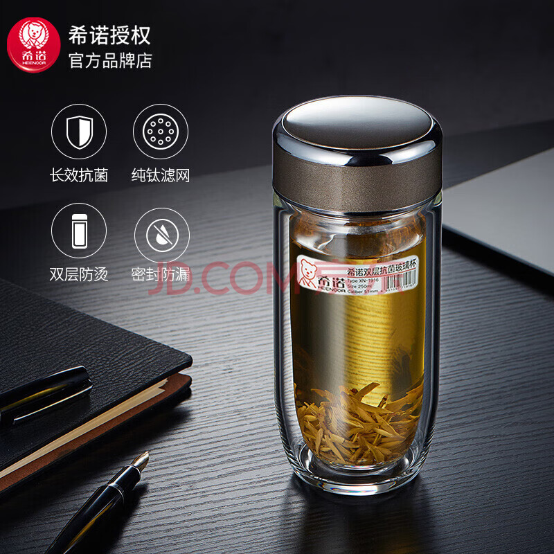 商品相册:希诺(heenoor)双层玻璃杯隔热男女士带滤网茶杯车清新绿250ml-大小适中-1916第1张/共3