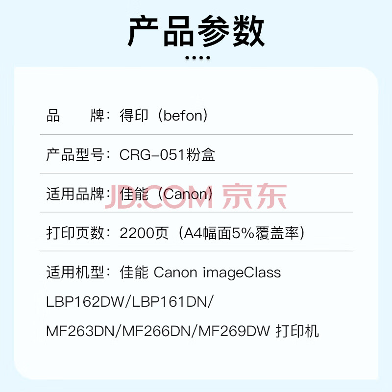 商品相册:得印(befon)得印CRG-051粉盒 适用佳能 iC MF269dw/266dn/263dn/LBP162DW/LBP161DN打印机墨盒 硒鼓 碳粉盒第