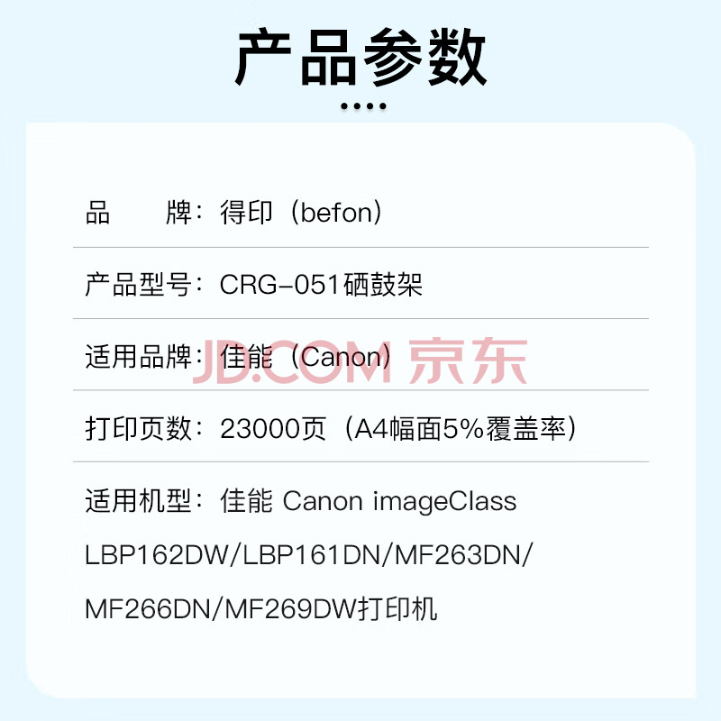商品相册:得印(befon)CRG-051硒鼓组件 适用佳能 iC MF269dw/266dn/263dn/LBP162DW/LBP161DN打印机硒鼓架 成像鼓第
