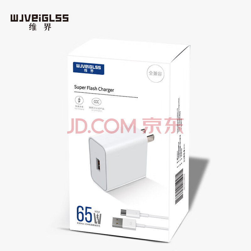 商品相册:维界 安卓数据线快充套装带插头充电线适用华为小米OPPO(65W充电器+6A数据线)USB-C快充线2米标配第