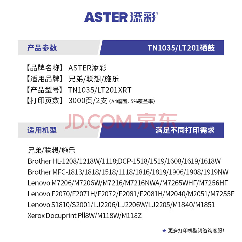 商品相册:添彩lt201粉盒 适用联想M7206硒鼓 m7216 7206w粉盒 lj2205硒鼓 2206W M7256WHF 1618 1208打印机墨盒 TN1035粉盒第
