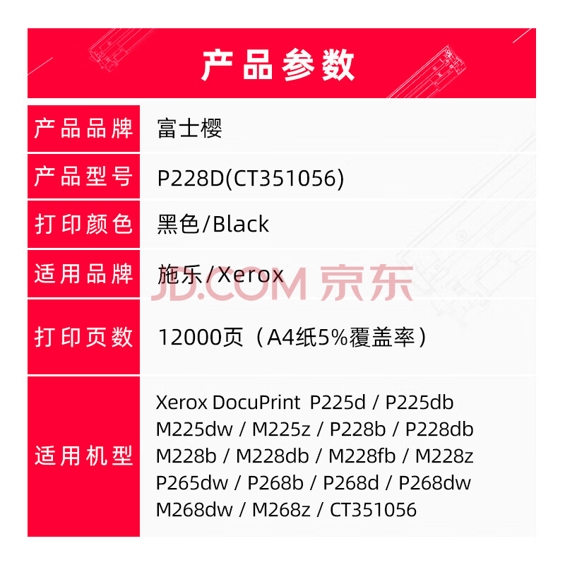 商品相册:富士樱P228d鼓架 适用施乐P225/M225/P228/M228/P265/P268/M268(d/db/dw/b/fb/z)感光鼓 CT351056页数:12000页第