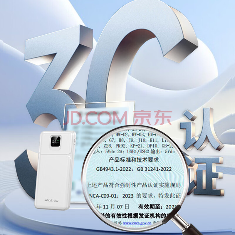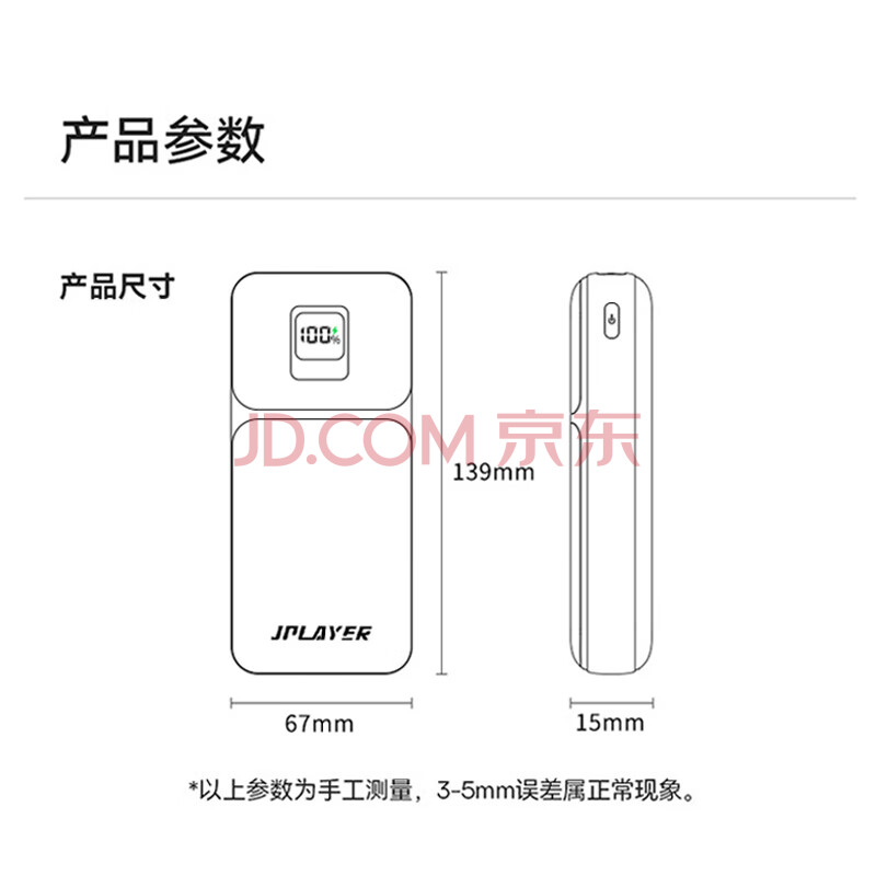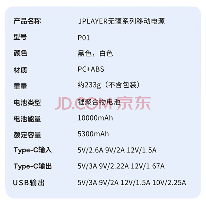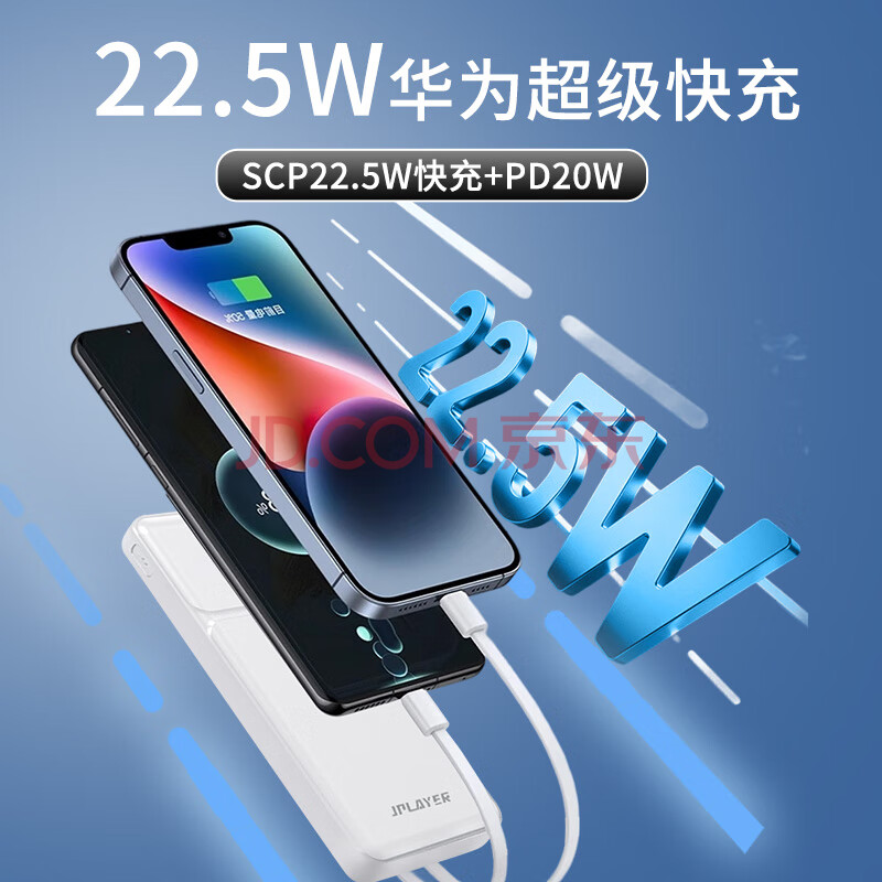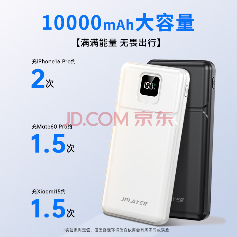 商品相册:JPLAYER 充电宝10000毫安时22.5W超级快充PD20W 兼容18W大容量移动电源支持苹果15安卓华为小米 黑第