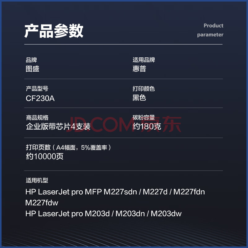 商品相册:图盛CF230A粉盒适用惠普M227fdw硒鼓HP M203dn 203d 203dw M227d 227sdn 227fdn打印机墨盒粉盒30a硒鼓CF230X第