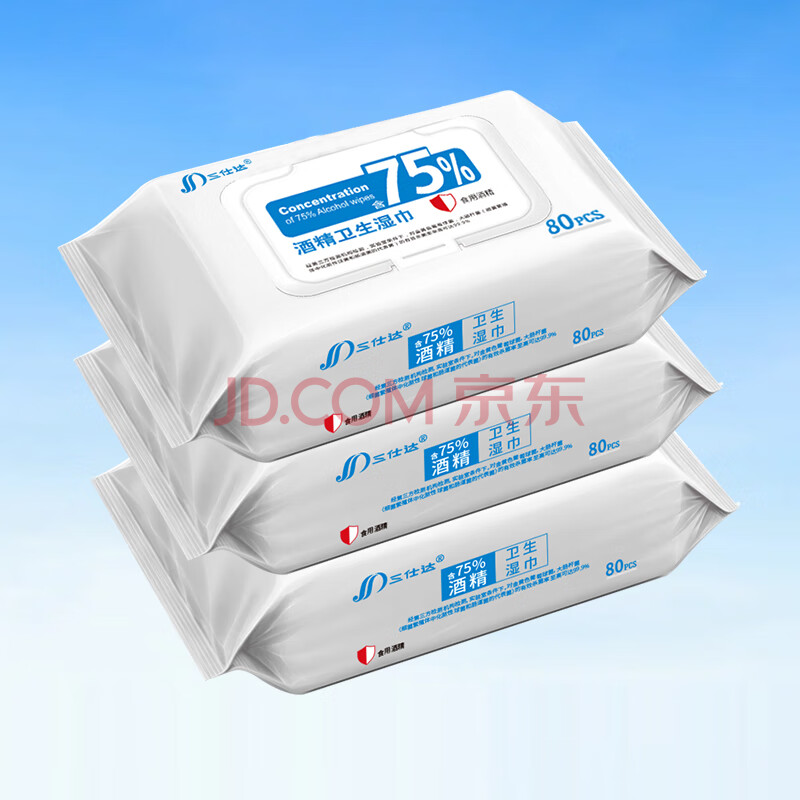 商品相册:三仕达食用级75度酒精湿巾80片*3包湿纸巾杀菌率99.9%卫生湿巾马桶杀菌第