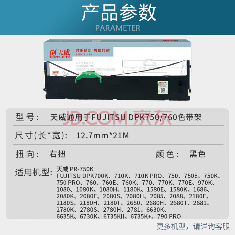 商品相册:天威DPK750色带(色带架含芯)黑色单支(适用于富士通DPK750 760 770系列)色带芯:21M*12.7MM第