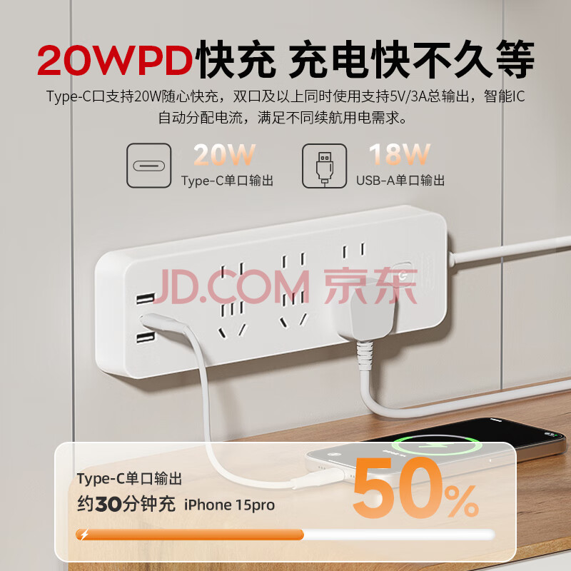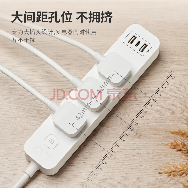 商品相册:德力西(DELIXI) 20W PD快充插座/插线板/插排/接线板 Type-c口+USB口+6插孔全长3米 总控开关第