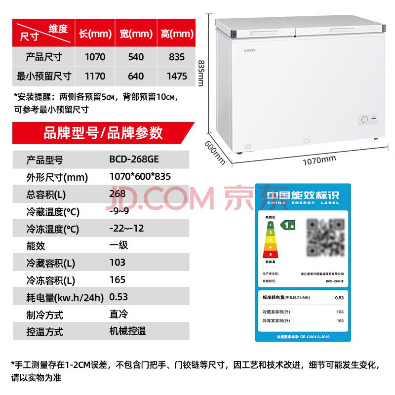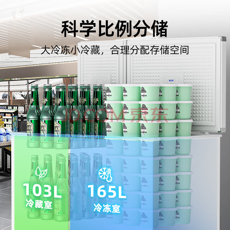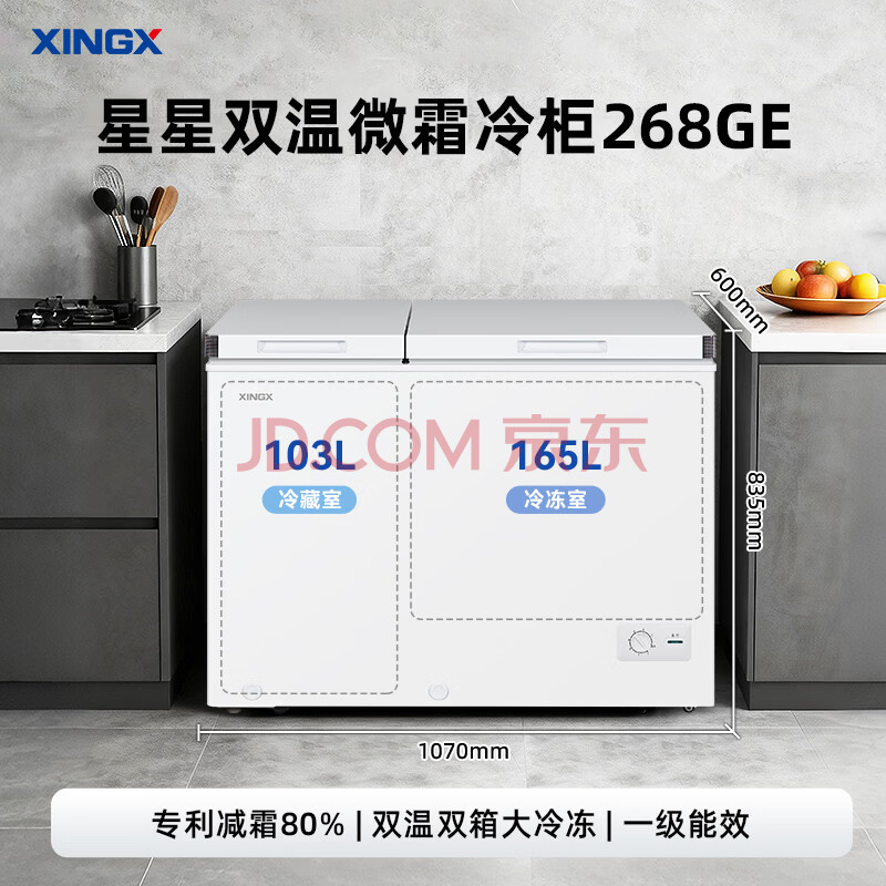 商品相册:星星(XINGX)268L双温家用卧式冰柜 大容量保鲜卧式一级能效冰箱 冷藏冷冻双温双箱减霜冷柜 BCD-268GE第