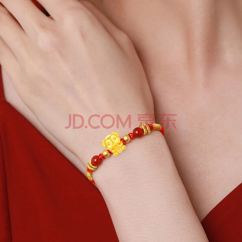 商品相册:Lossot生日礼物本命年十二生肖猪足金福猪金珠黄金转运珠手链金猪红绳第