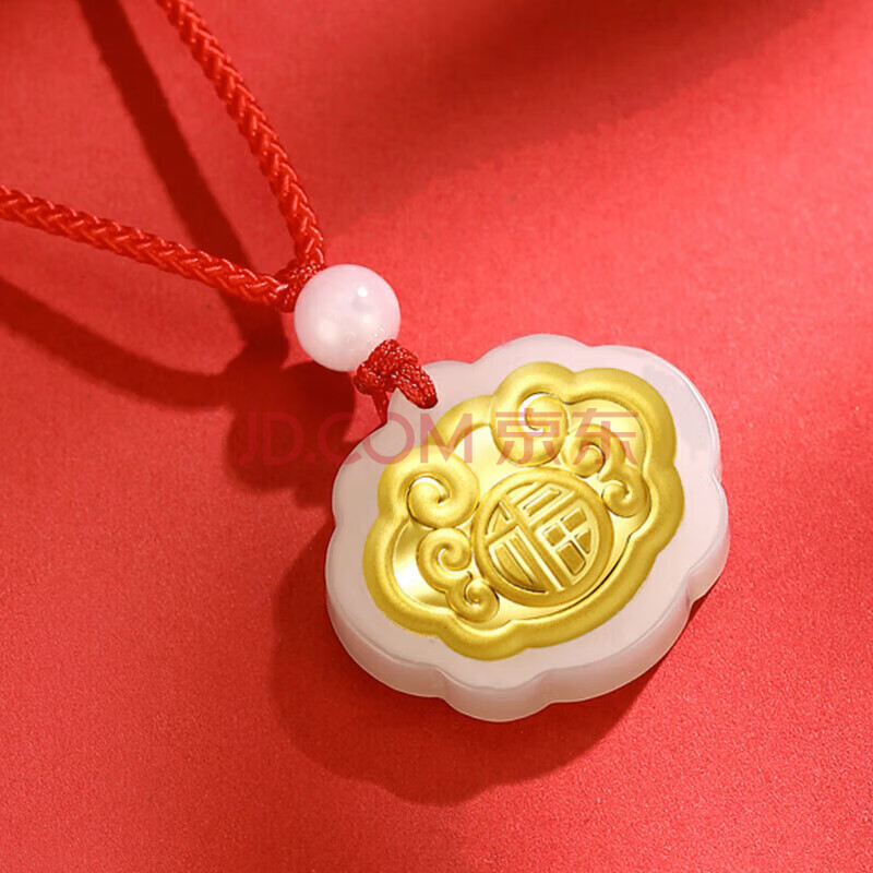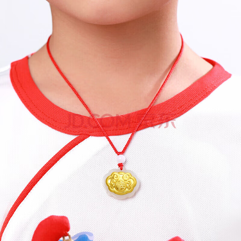商品相册:Lossot女孩男孩生日礼物如意福金镶玉吊坠项链宝宝福锁百天周岁出生礼物第
