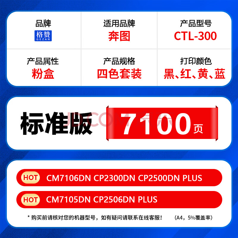 商品相册:格赞CTL-300粉盒适用奔图CP2506DN PLUS硒鼓CM7105DN CM7106DN CP2300DN CP2500DN PLUS打印机墨盒 四色套装第