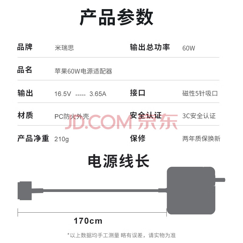 商品相册:米瑞思(mryc)苹果笔记本电脑充电器60W适用MacBook Pro A1502 A1425 A1435 1.7米电源适配器线16.5V3.65A第