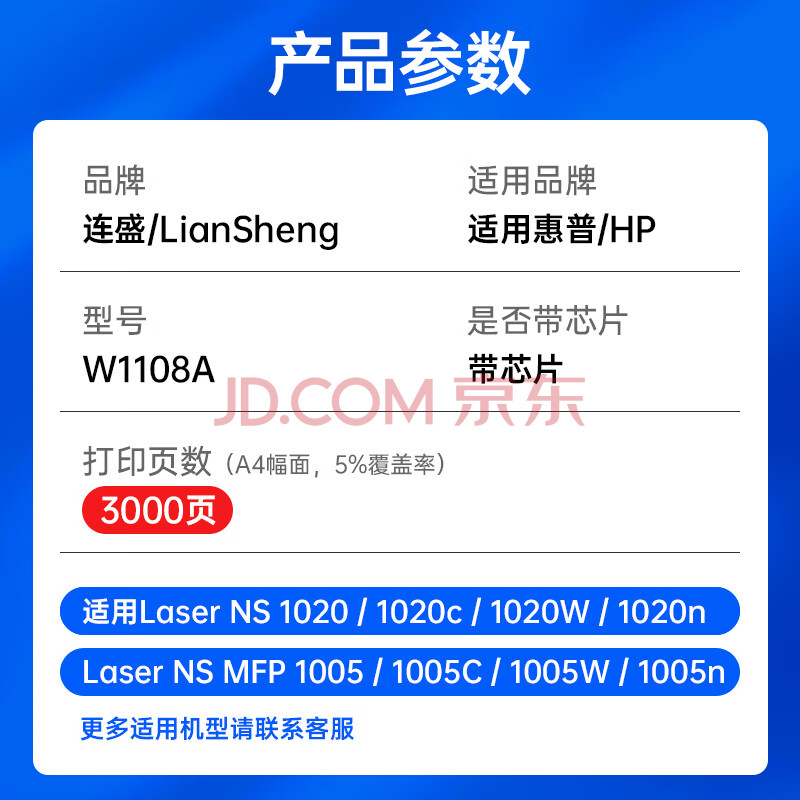 商品相册:连盛适用 惠普NS1005w墨粉 108A粉盒 HP laser ns mfp 1005c硒鼓 ns1020W W1108A打印机闪充碳粉 8支装第