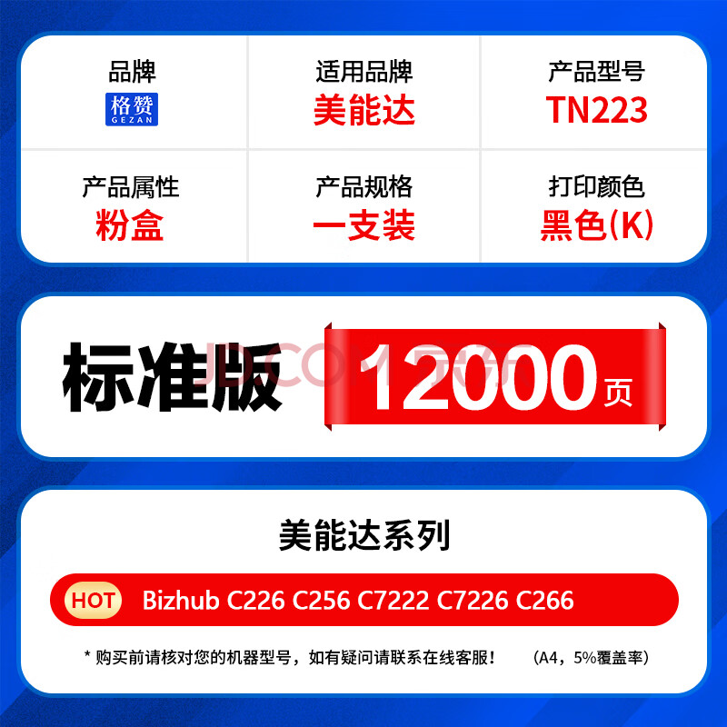 商品相册:格赞适用柯尼卡美能达C226粉盒TN223墨盒Bizhub c256碳粉C7222墨粉C7226 C266打印机震旦ADC225/265黑色第