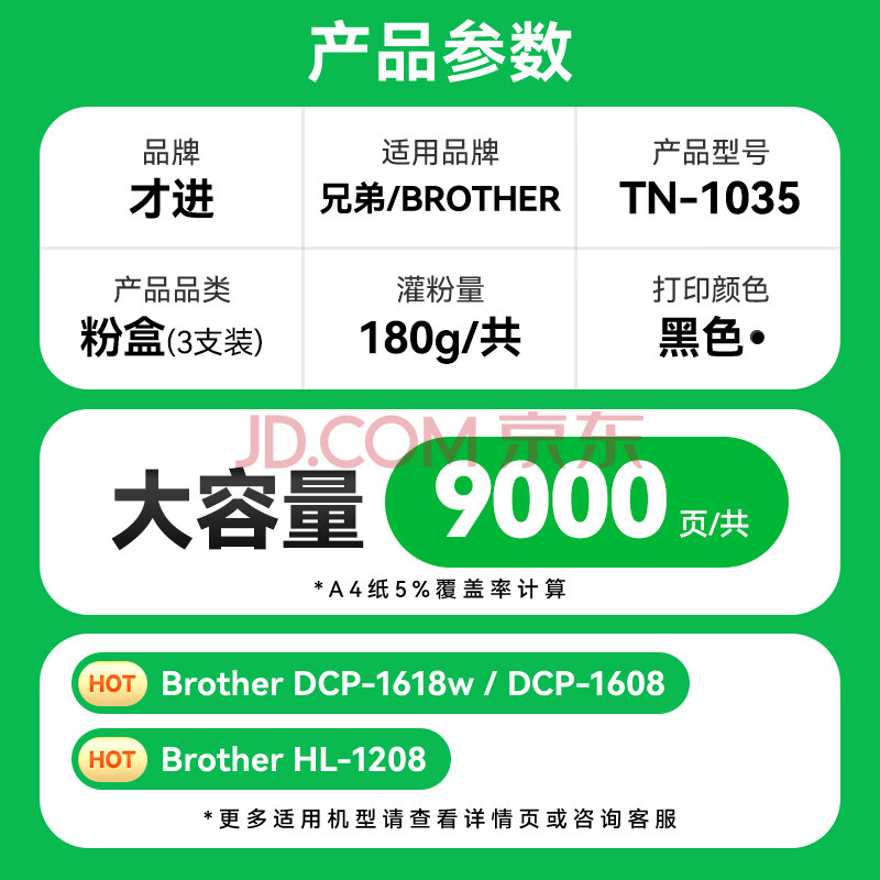 商品相册:才进 适用兄弟tn1035粉盒1618w dcp1608打印机硒鼓hl1208 1218w mfc1919nw 1906 1908 1813 1816 1818 1819第