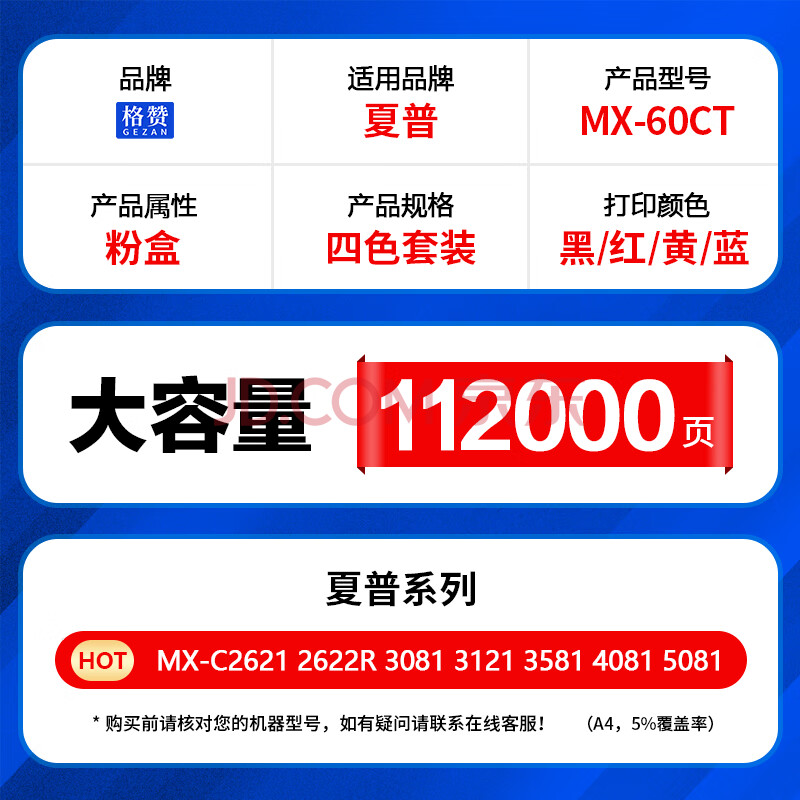 商品相册:格赞MX-60CT适用夏普MX-C2622R粉盒C3081 3581 4081墨盒5081 6081 2621 3082 6082打印机硒鼓复印机墨粉四色套装第