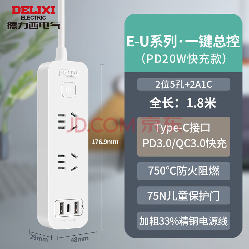 商品相册:德力西(DELIXI) 20W PD快充插座/插线板/插排 Type-c口+USB口+2插孔全长1.8米 总控开关第