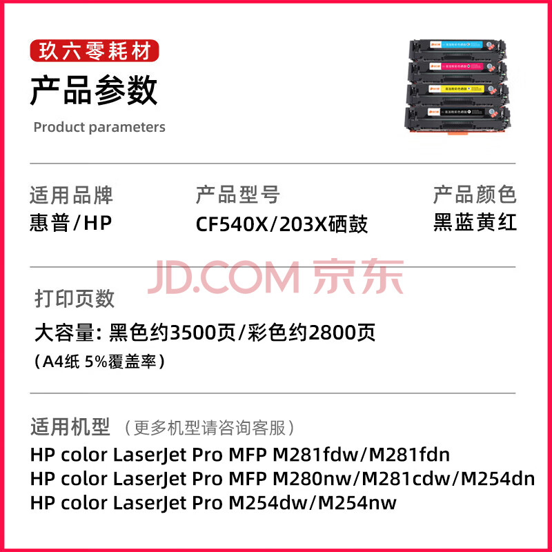 商品相册:玖六零惠普M281fdw硒鼓适用HP203A硒鼓M281fdn/cdw M254dw M280nw M254nw/dn打印机墨粉盒CF540A/X碳粉盒套装第