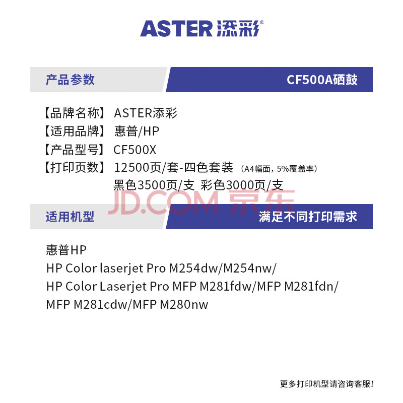 商品相册:添彩202a硒鼓带芯片适用惠普m281fdw硒鼓 m254dw m254nw m281fdn m280nw打印机粉盒 cf500a墨盒 加大容量蓝色第