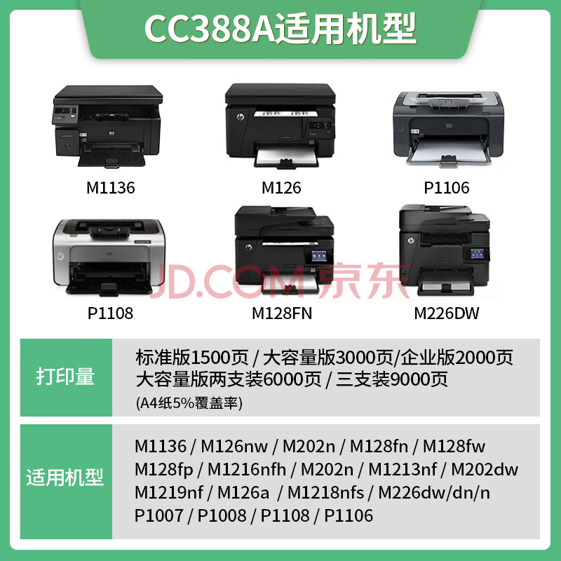 商品相册:京杰388a硒鼓cc388a适用HP惠普m1136硒鼓m126a墨盒p1108 p1106 1007 m126nw m128fn m1213nf 226dn硒鼓企业版第