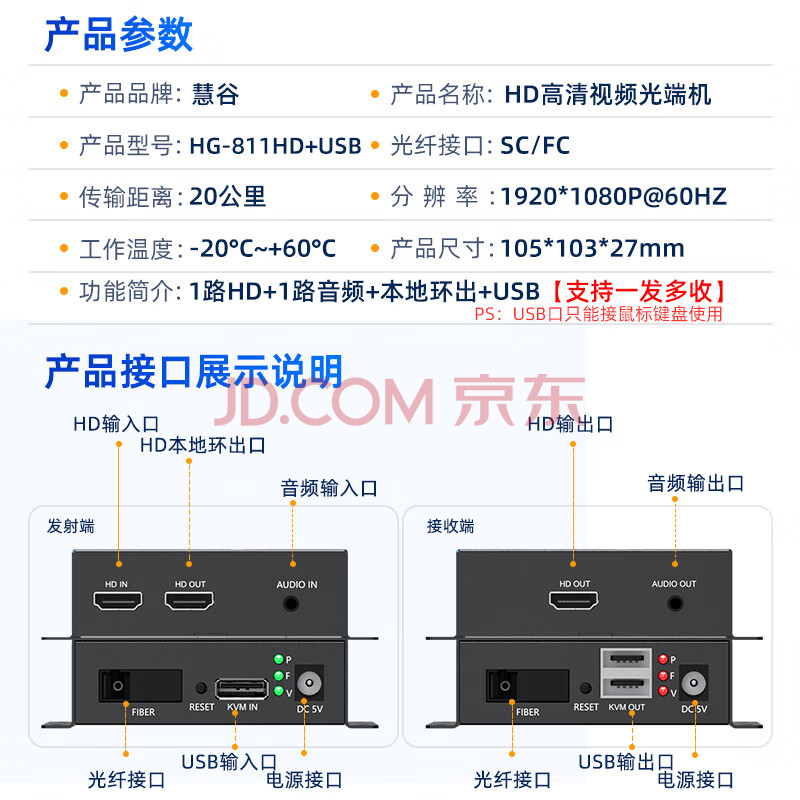 商品相册:慧谷 HDMI光端机 高清视频HDMI光纤延长器 1路HDMI+音频+本地环出+USB SC接口 1对价 HG-811HD+USB第