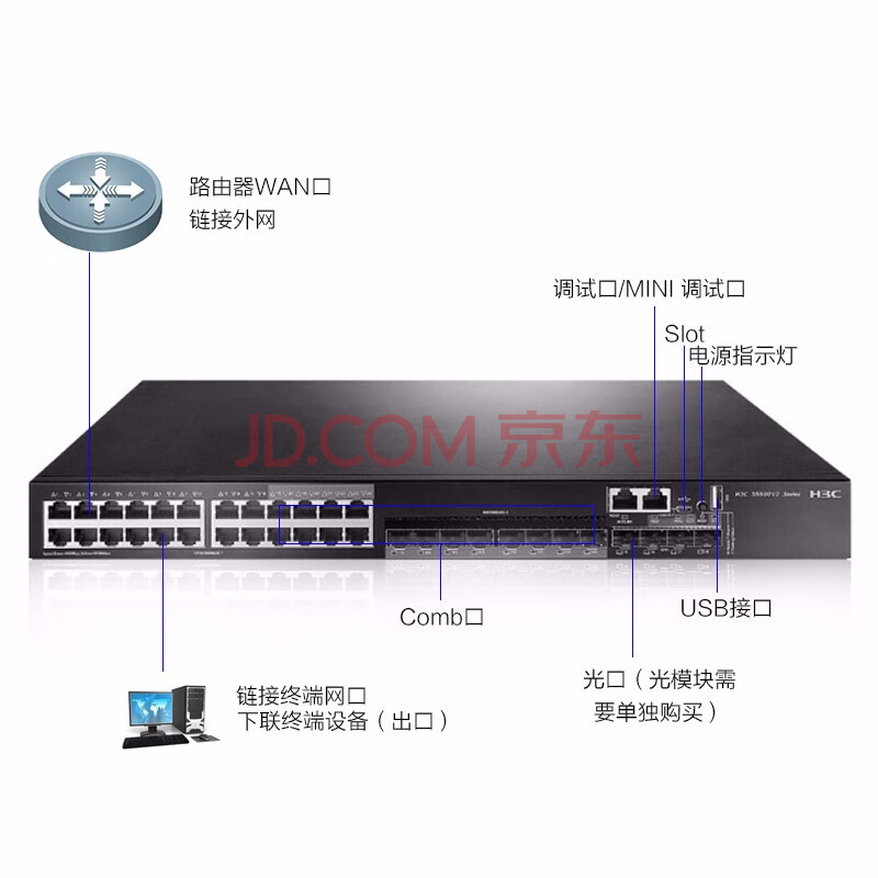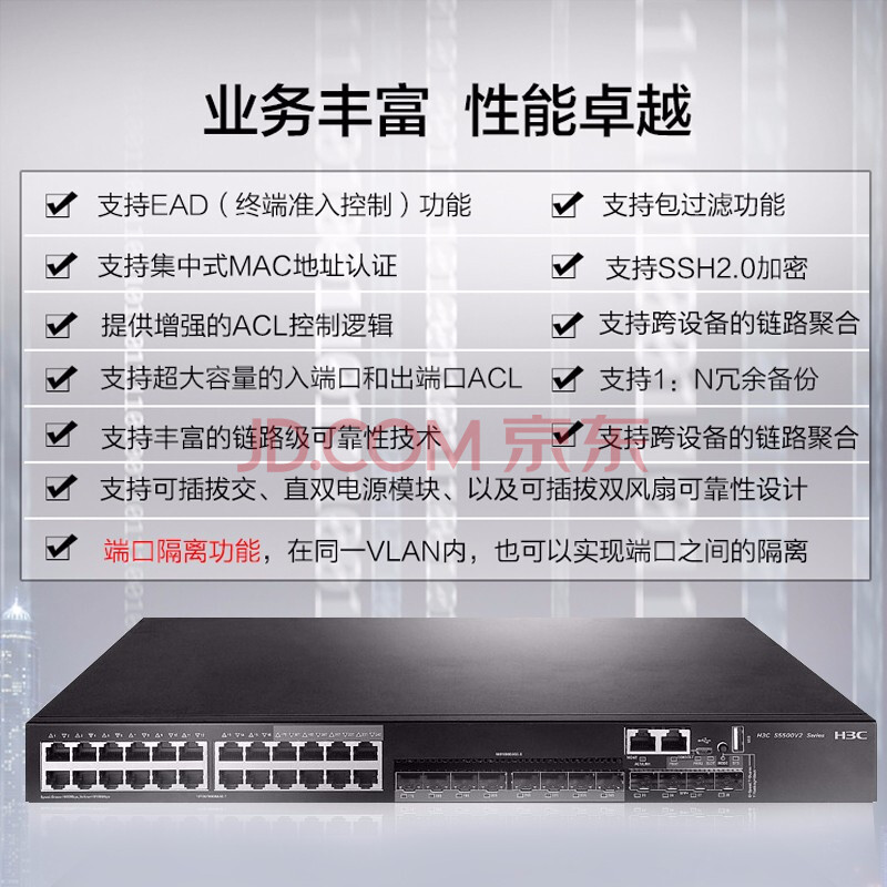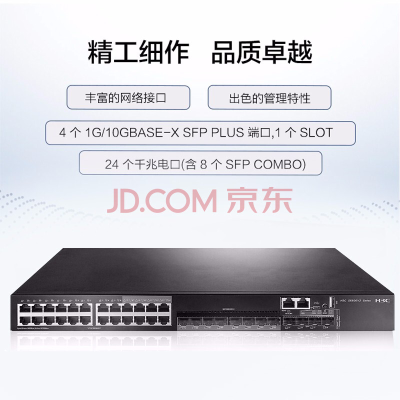 商品相册:华三(H3C)S5500V2-28C-EI 24口千兆电+4万兆光+1扩展槽三层网管企业级网络核心交换机 自带单电源+双风扇第