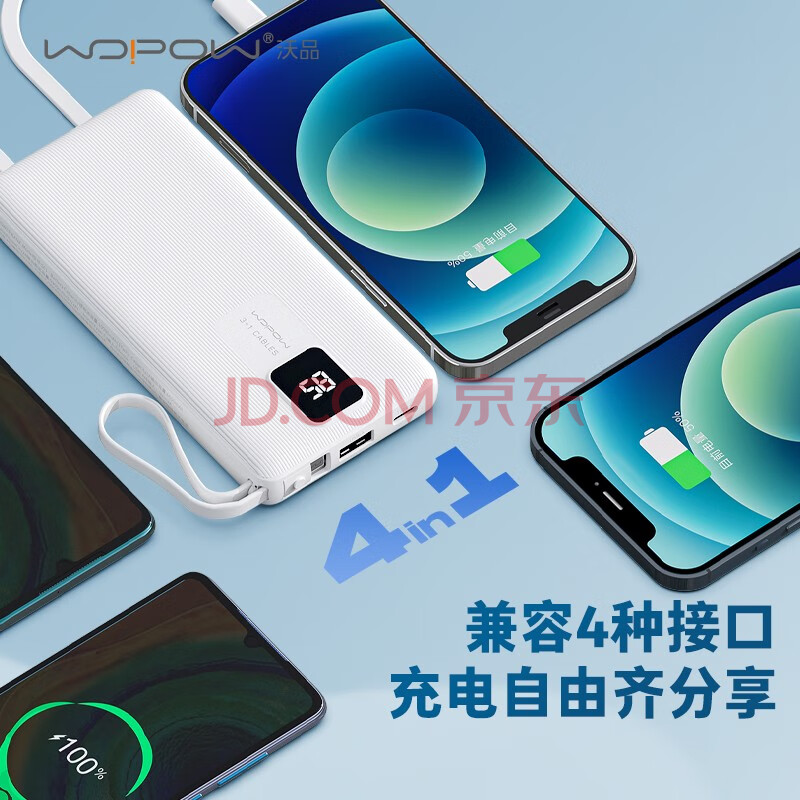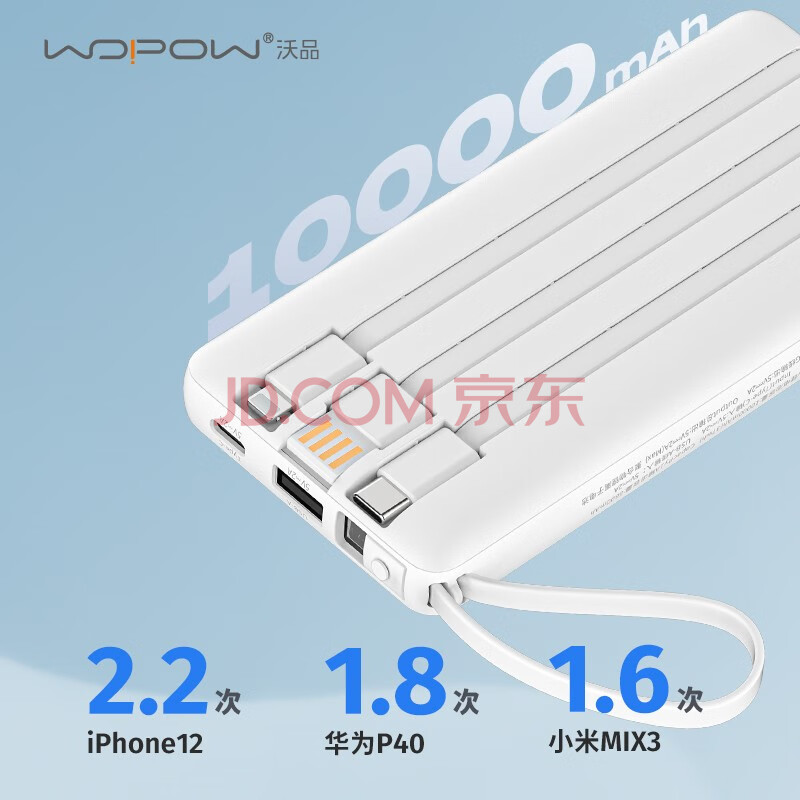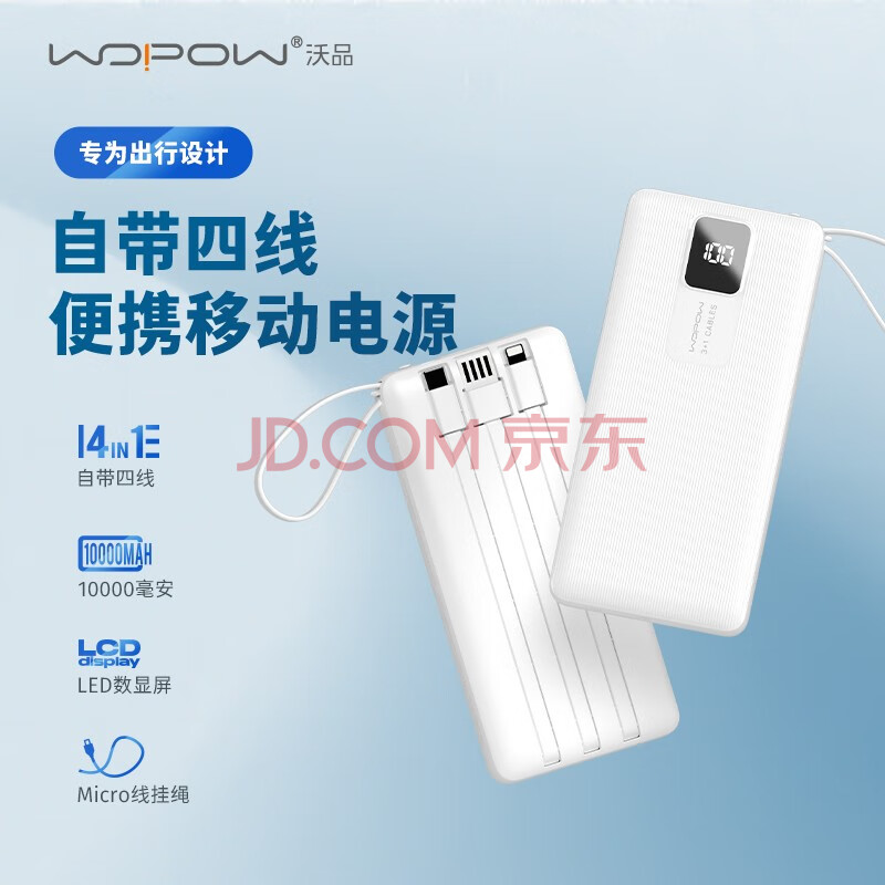 商品相册:WOPOW沃品S01充电宝自带四线便携移动电源白色10000mAh第